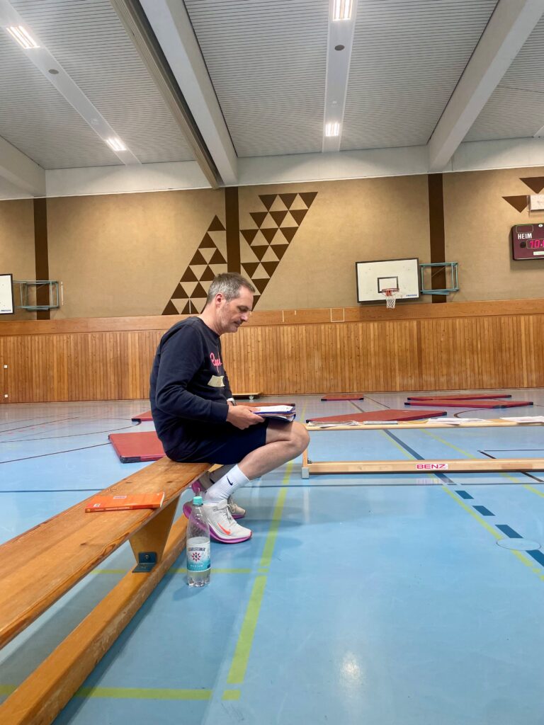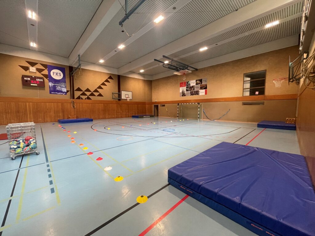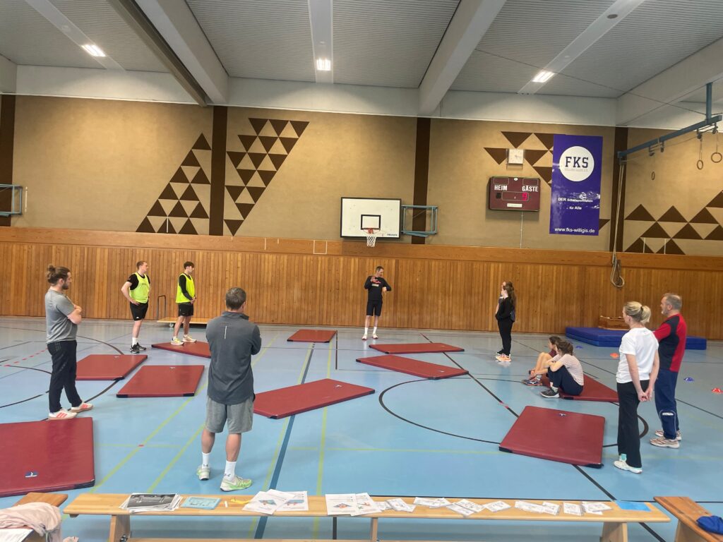 Den Auftakt bildete die erste Fortbildungseinheit von 9:00 bis 11:00 Uhr zum Thema „Gute Bewegungs-, Spiel- und Sportangebote für die Grundschule und Sek I“, geleitet von Dr. Stephan Herzberg. Zu Beginn wurden zentrale Begrifflichkeiten geklärt und der Spielbegriff pädagogisch eingeordnet. Im weiteren Verlauf erhielten die Teilnehmenden praxisnahe Einblicke in verschiedene Spielideen, darunter das Spiel „Sanitäterfangen“ mit variierenden Rollen, wobei insbesondere auch Impulse zur sprachlichen Begleitung durch die Lehrkraft gegeben wurden. Ein weiterer Schwerpunkt lag auf dem Spiel „Schatzkammer“, das unter anderem als Hinführung zu einem taktischen Spielverständnis dient. Hierbei wurden eigene Regeln und Spielideen entwickelt. Ergänzend wurde die sogenannte „Kläranlage“ als Instrument zur Streitschlichtung vorgestellt und erprobt. Auch die Bereiche „Akrobatik“ sowie „Ringen und Raufen“ wurden nach einer kurzen Einführung im Format einer Lerntheke praktisch umgesetzt – stets begleitet von pädagogischen Fragestellungen zu gelungenen Spielangeboten.